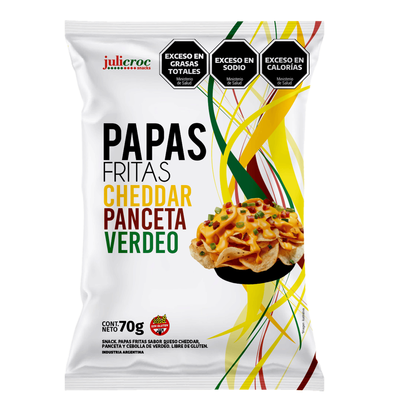 Ingredientes: Papas, aceite, ARO/SAB artificial a queso cheddar, panceta y cebolla de verdeo.